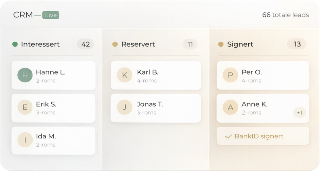Alle leads, reservasjoner og signeringer håndteres i ett og samme system. Ingen manuell oppfølging. Full oversikt på tvers av alle enheter.